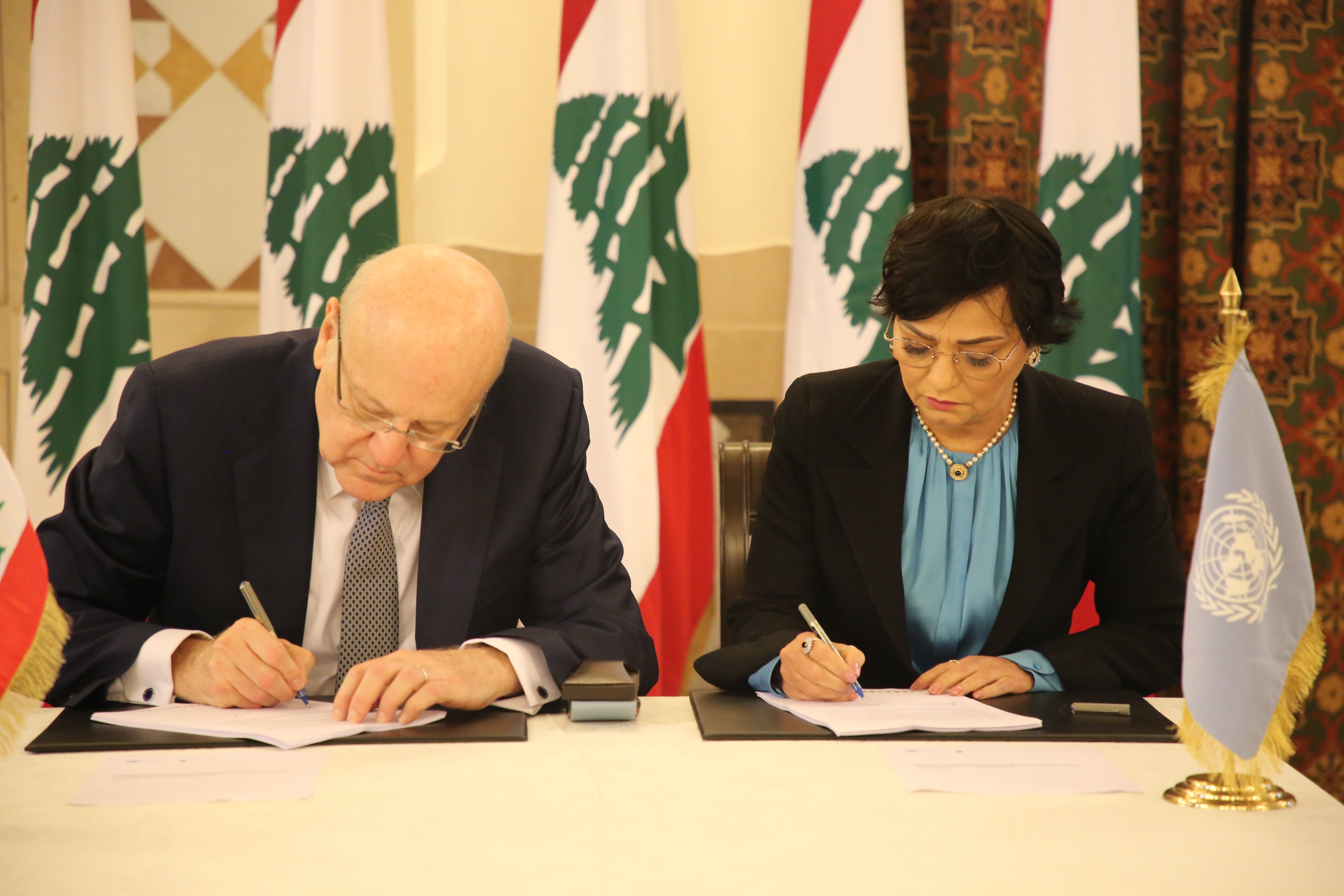 Lebanese Prime Minister Najib Mikati and UN Resident Coordinator for Lebanon Najat Rochdi signed today the “United Nations Sustainable Development Cooperation Framework” (UNSDCF) that is meant to strengthen the existing and ongoing cooperation between both parties on promoting the principles of sustainable development, and build the foundations for a prosperous and inclusive Lebanese society, where no one is left behind.